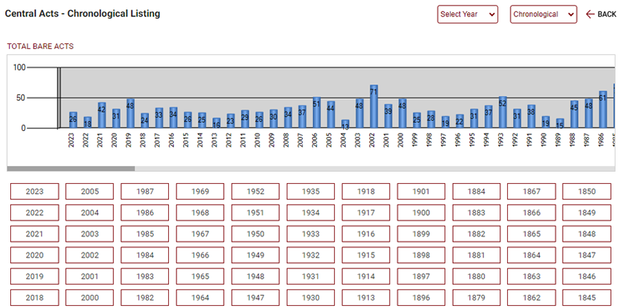 Clicking on Chronological index shows the Bar Chart & yearwise listing of the Bare Act. One can click on the number appearing on the Bar to view Acts appearing in that year.