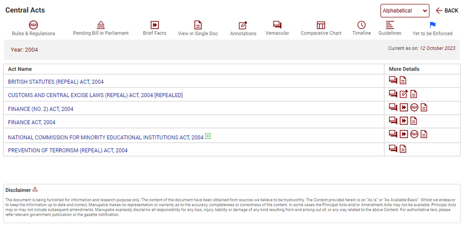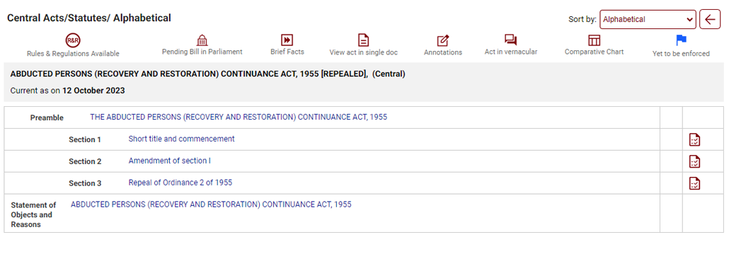 - Bare Acts show different signs in front of them. These are also displayed on the top.