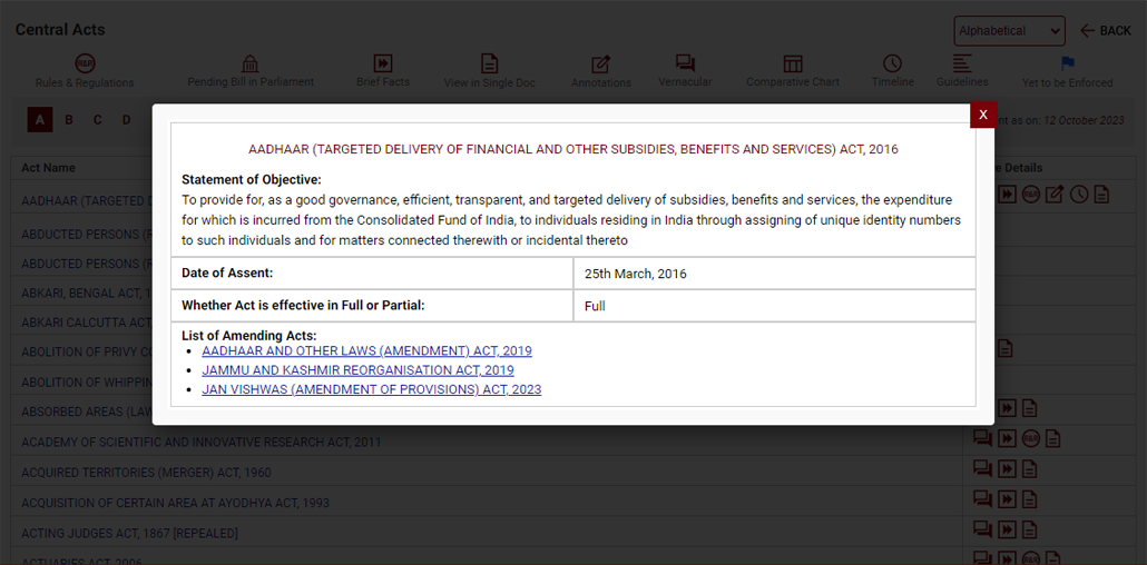 In the example below we have clicked on Alphabet A. All the acts starting with A are listed.
