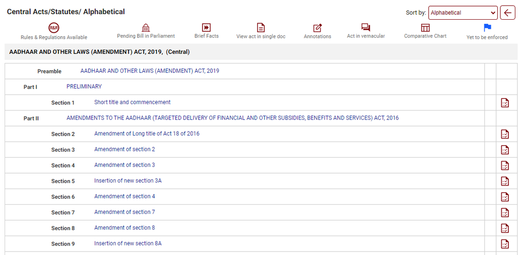 When we click on the Act with the Parliament sign, the Act displayed shows a a flag on the top. This flag denotes that there is a proposed bill pending in the parliament pertaining to the Act.