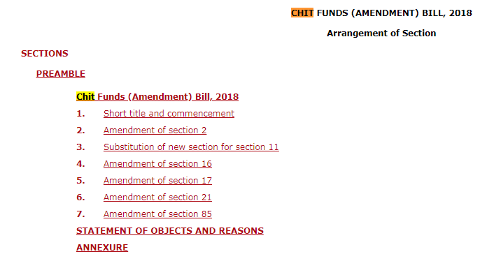The Flag will also appear against the section of the Act, which will be amended by the Pending Bill in the Parliament. By clicking on this flag we can view the relevant clause of the pending bill. Clicking on the flag sign displays the Table of Content of the relevant Bill which is pending in the Parliament, as shown below.