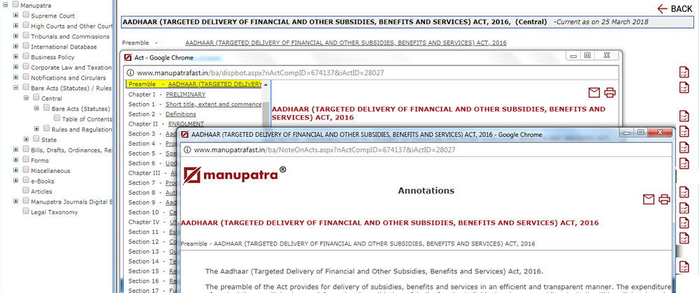 When we click on the Act, there is a Maroon colour icon which appears across in front of the Section/Order/ Article. Click on the icon to view the Commentary on that particular Section/Order/Article. These will appear only in Acts, for which commentary is available.