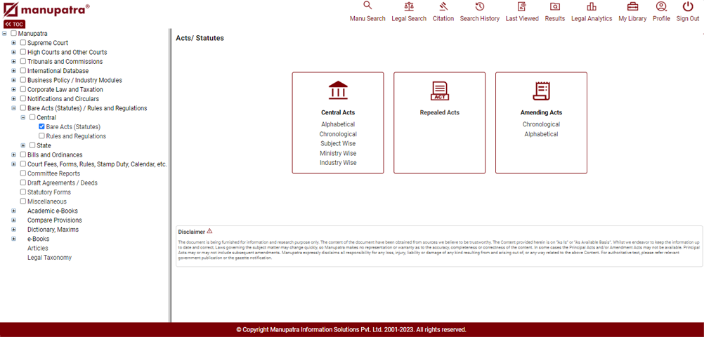 Bare Acts / Statutes can be viewed directly from the TOC. Click on the + sign next to the Bare Acts & then click
