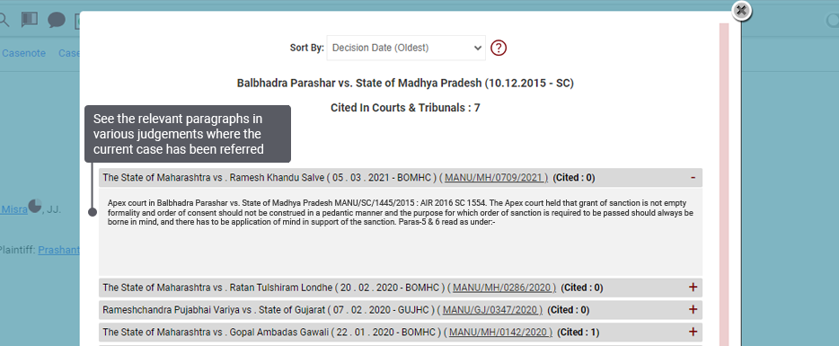 This feature enables the user to see the relevant paragraphs in various judgments, where the current case has been referred. Cited in Para link appears on the top of the Judgment.