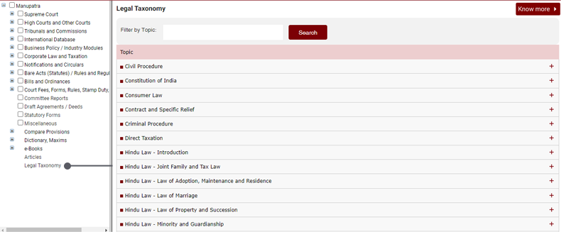 Manupatra Taxonomy is a hierarchical structure which lists the topics and the sub topics under that. The aim is that each topic covered, broadly reflects the terms associated with it as a user might expect to find it in major textbooks. It will aid the user in choosing keywords consistently and appropriately.