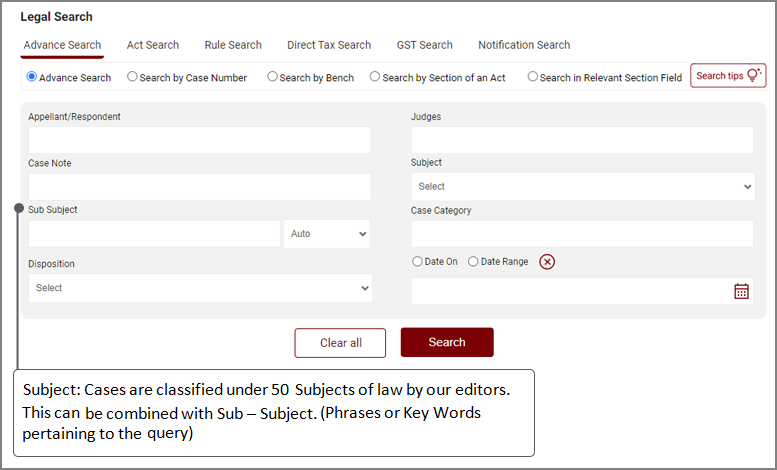 - Legal Search allows the user to search the Judgments based on their Subject.
