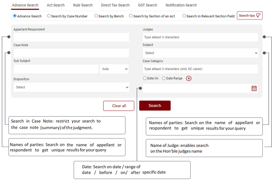 The case laws in Manupatra are divided into fields. Each field contains a specific information (e.g., appellant/respondent name, judges name, equivalent citation, subject, judge name, citation, acts, rules, order etc). Legal search allows you to search on a specific field or a combination of fields.